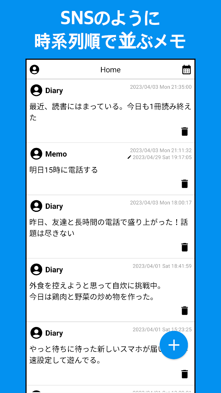 見た目はSNS風ですが、勿論オフラインのアプリですので、書いた内容が見られるのは自分だけです。