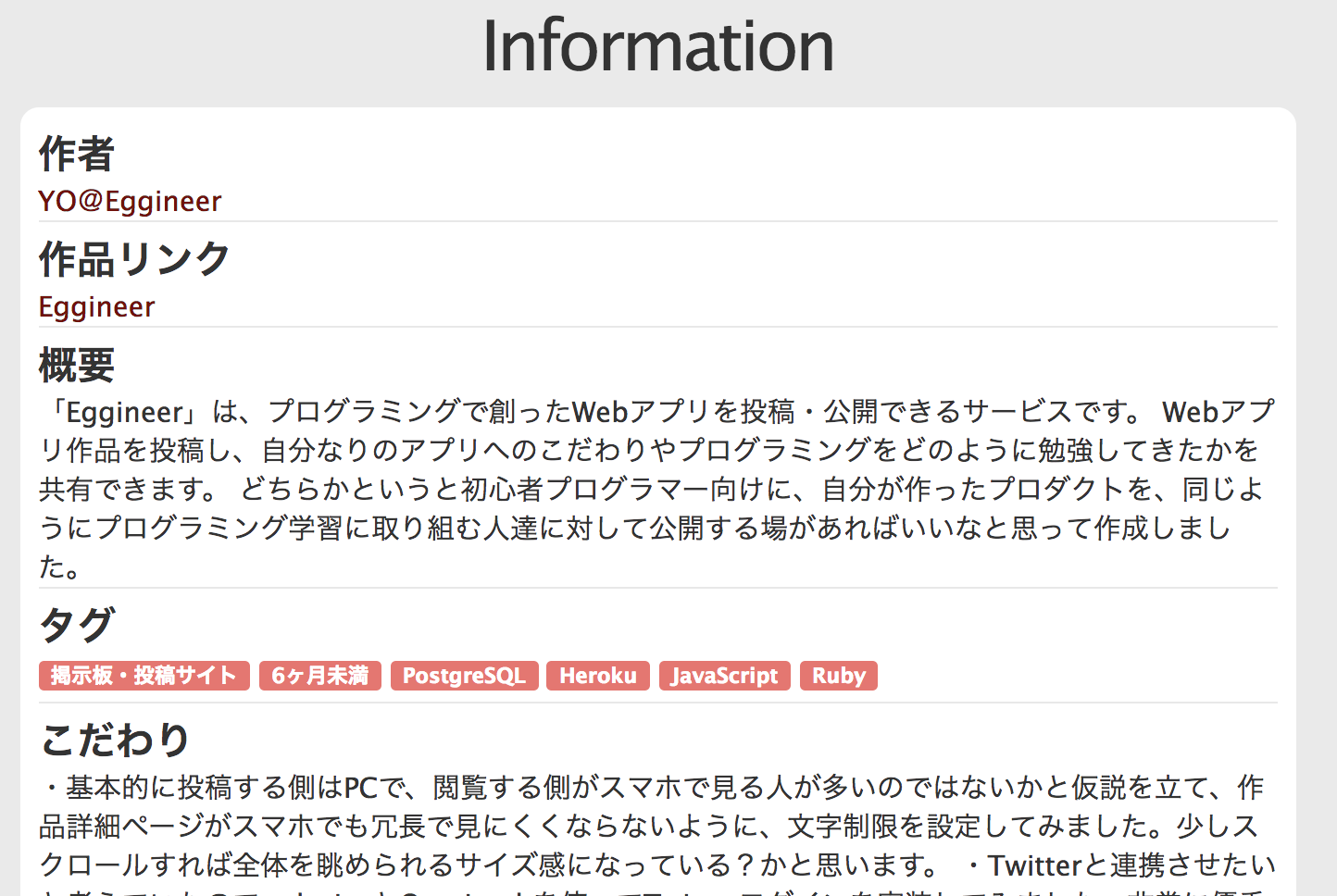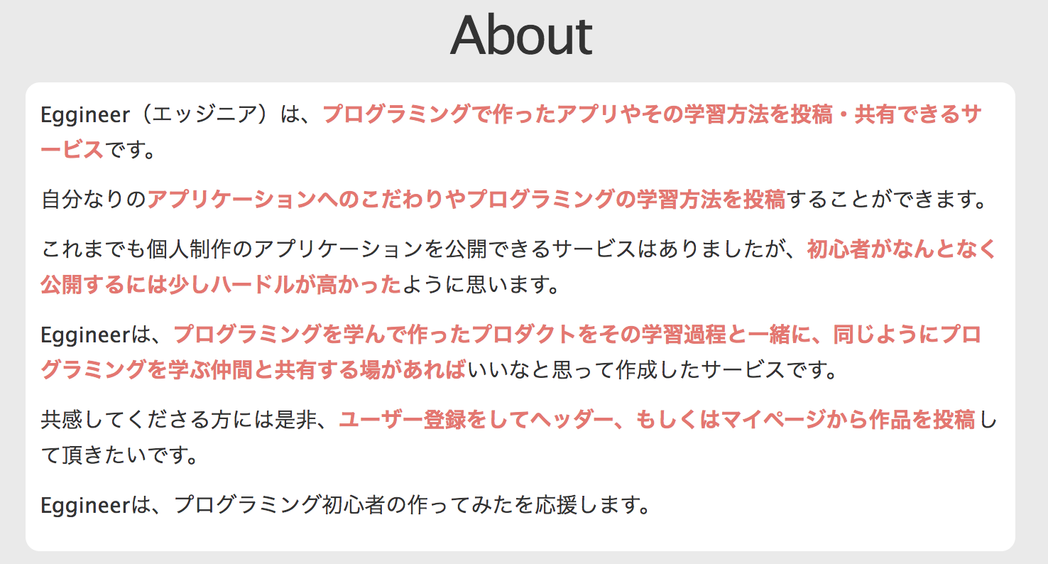 Eggineer(エッジニア)は、プログラミングで作ったアプリやその学習方法を投稿・共有できるサービスです。自分なりのアプリへのこだわりや、その学習・開発過程を投稿することができます。プログラミングを学んで作ったプロダクトをその学習過程と一緒に、同じようにプログラミングを学ぶ仲間と共有できる場があればいいなと思って作成しました。