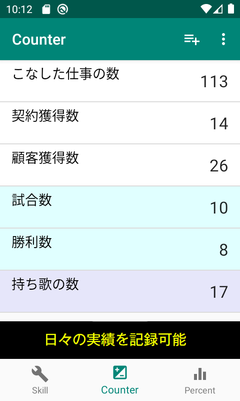 スキル、カウンター、パーセントの3つの機能をご用意しています。