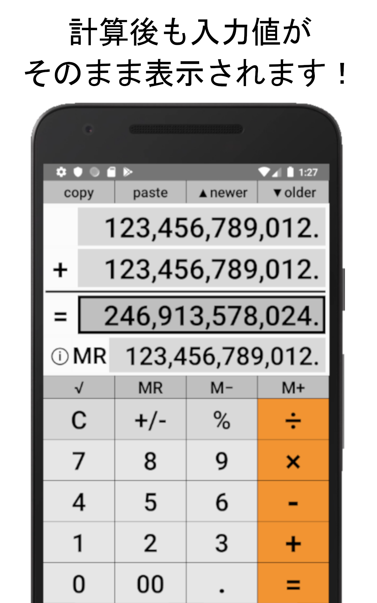 計算後2つの入力値と計算符号と結果が一緒に表示されるので、一目でその計算全体を確認できます。