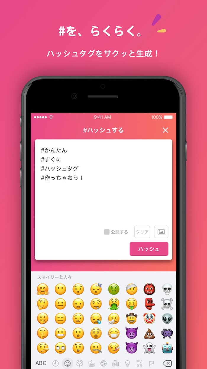 HASHを使うとキーボード入力の際の面倒な「#」の入力をすることなく、ハッシュタグにしたい文字を入力するだけでさくっとハッシュタグを作ることができます。