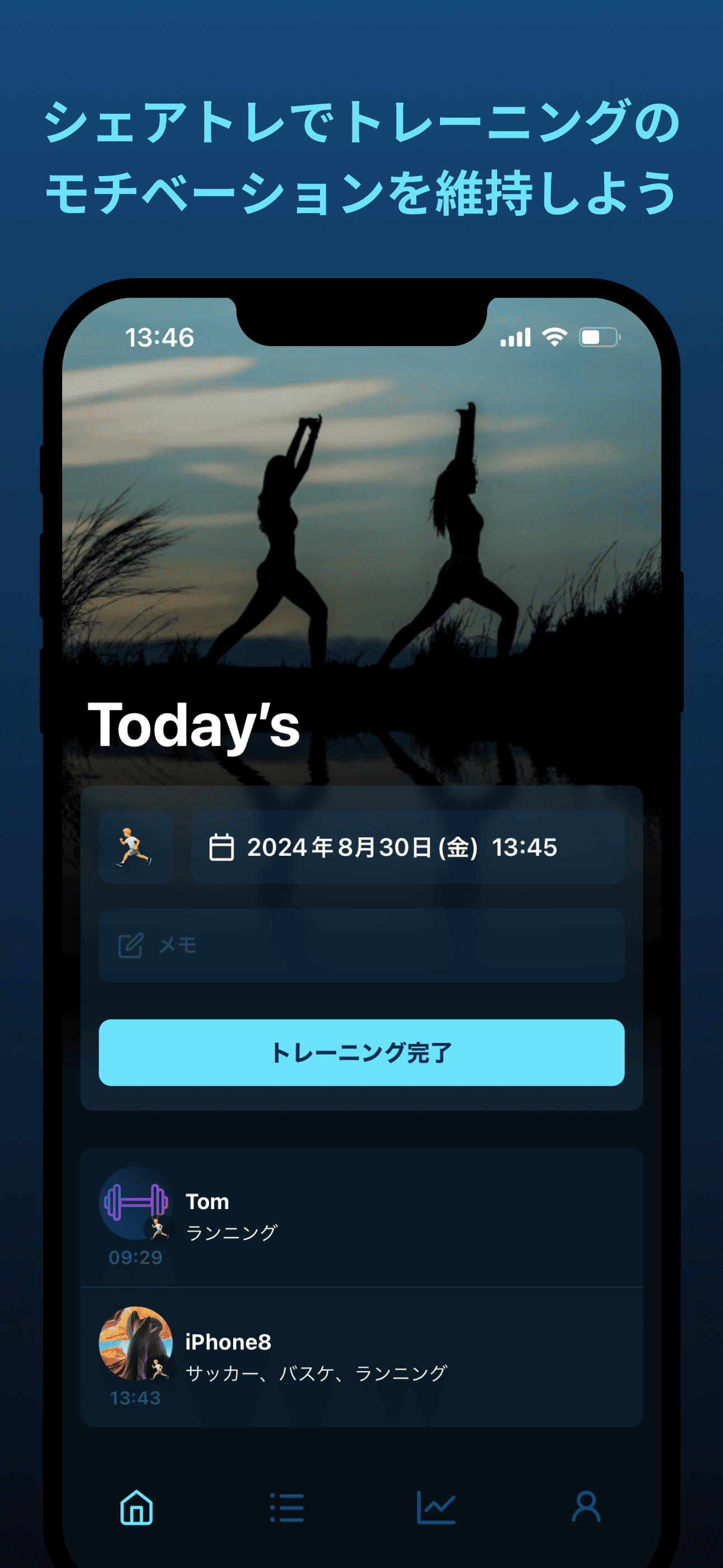 アプリは誰でも使いやすいシンプルなデザインと操作性で、一緒にトレーニングしたい人にもおすすめしやすいです!