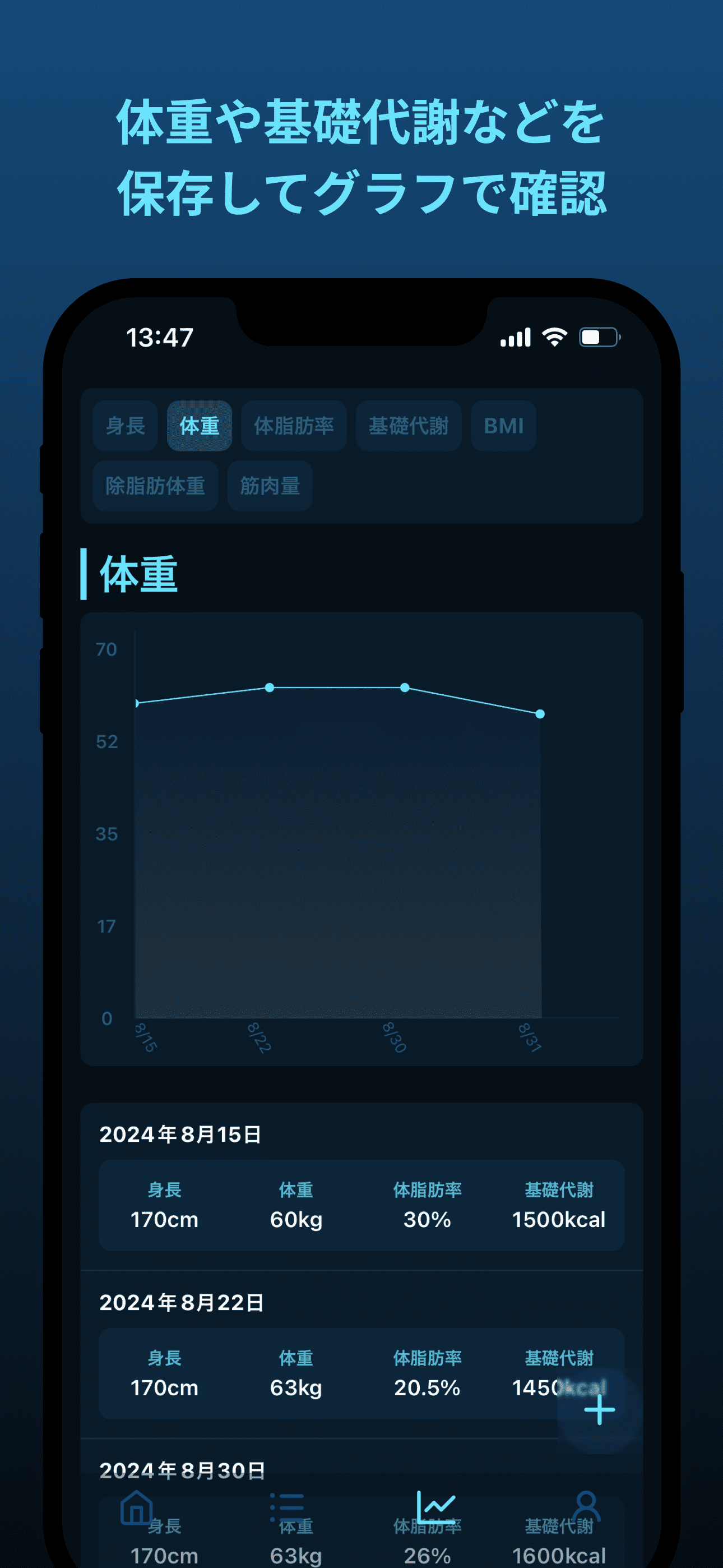 ・自分だけで体重やBMIなどを記録