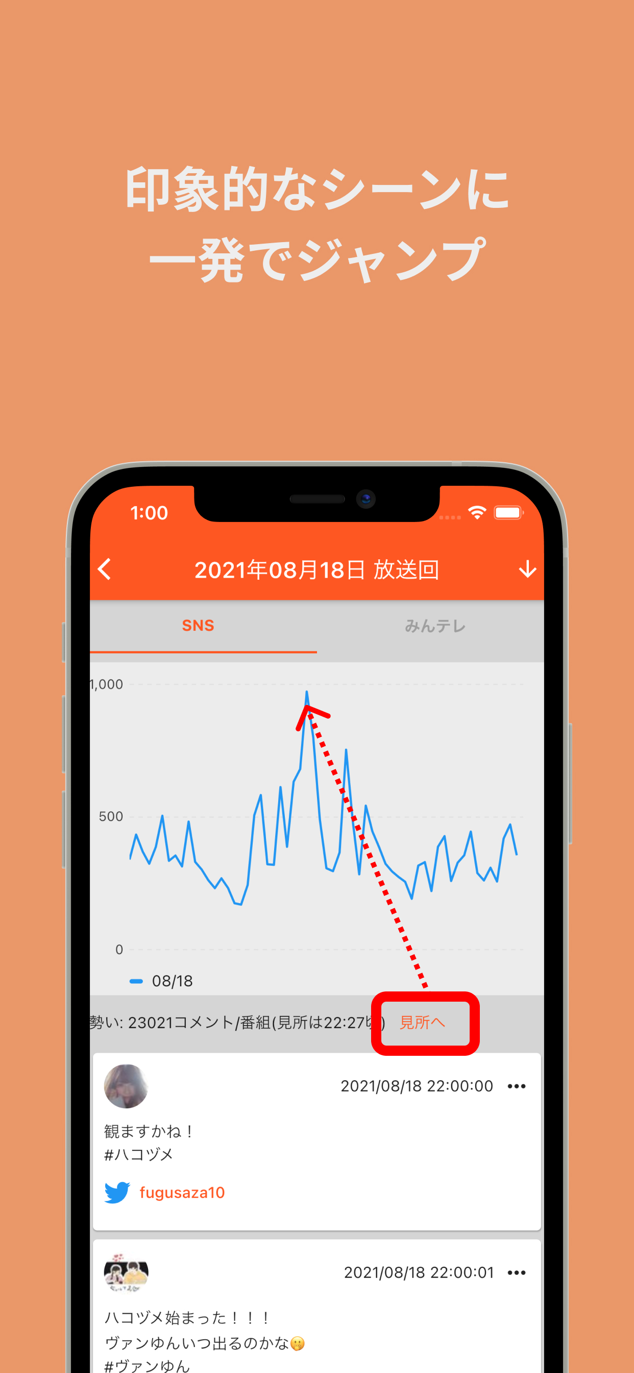 注目を集めるシーンほど、瞬間的なツイート数が増大します。そこで、コメントの最も多かった時間帯を「見所」として定義し、見所ボタンを押すと、その時間帯のコメント内容までジャンプでき、素早く番組を振り返ることができます。