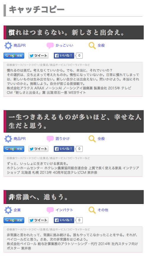 「キャッチコピー集めました。」はキャッチフレーズ、見出し、タイトルなどを考える時に参考となる「ことば」を検索するWEBサービスです。