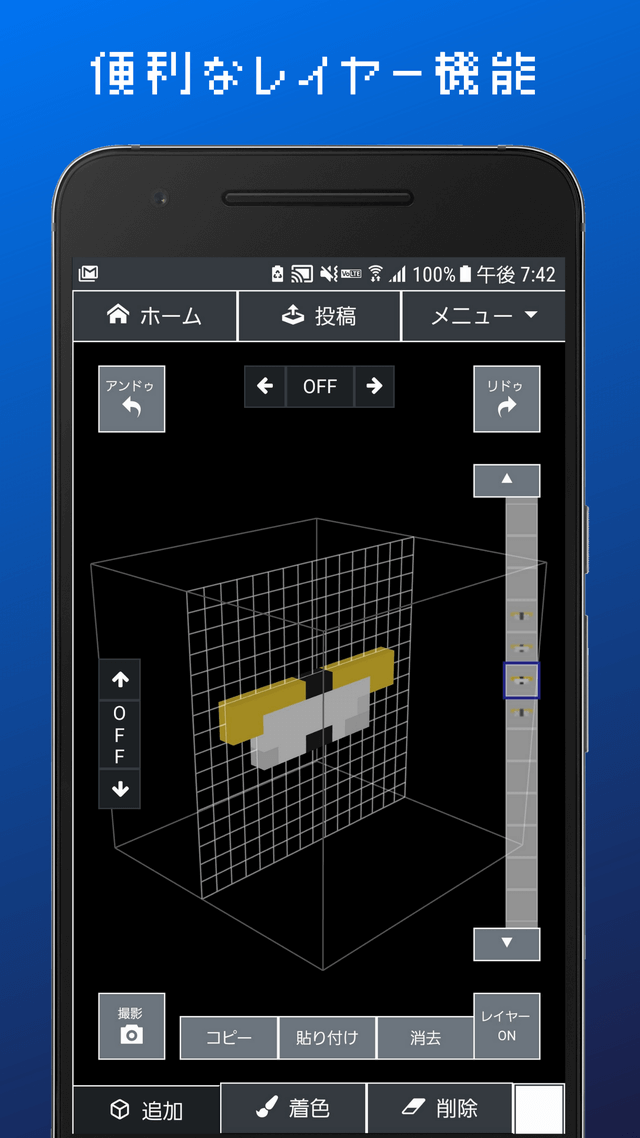 3Dドット絵(ボクセルアート)が作れるアプリ。作った作品は全世界に公開できるので、自分の作品にイイネを付けてもらえたり、他の人の作品にイイネを付けたりが可能です。また作品を好きな角度から撮影機能もあるので、プロフ画像やアイコン作成にも使っていただけます。