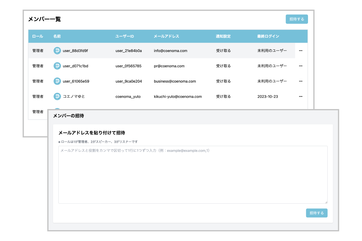 リスナー、スピーカー、管理者の3つの権限が簡単に設定できます。