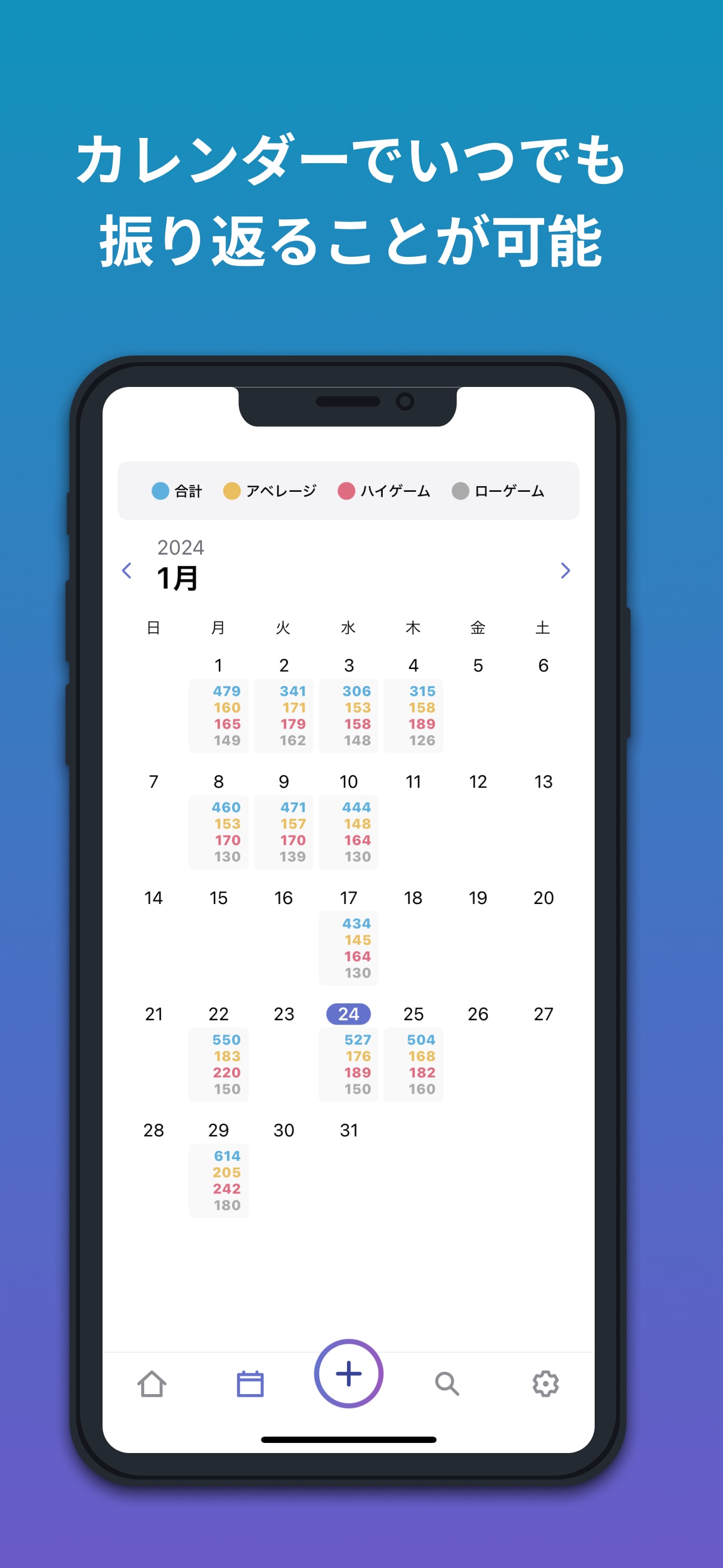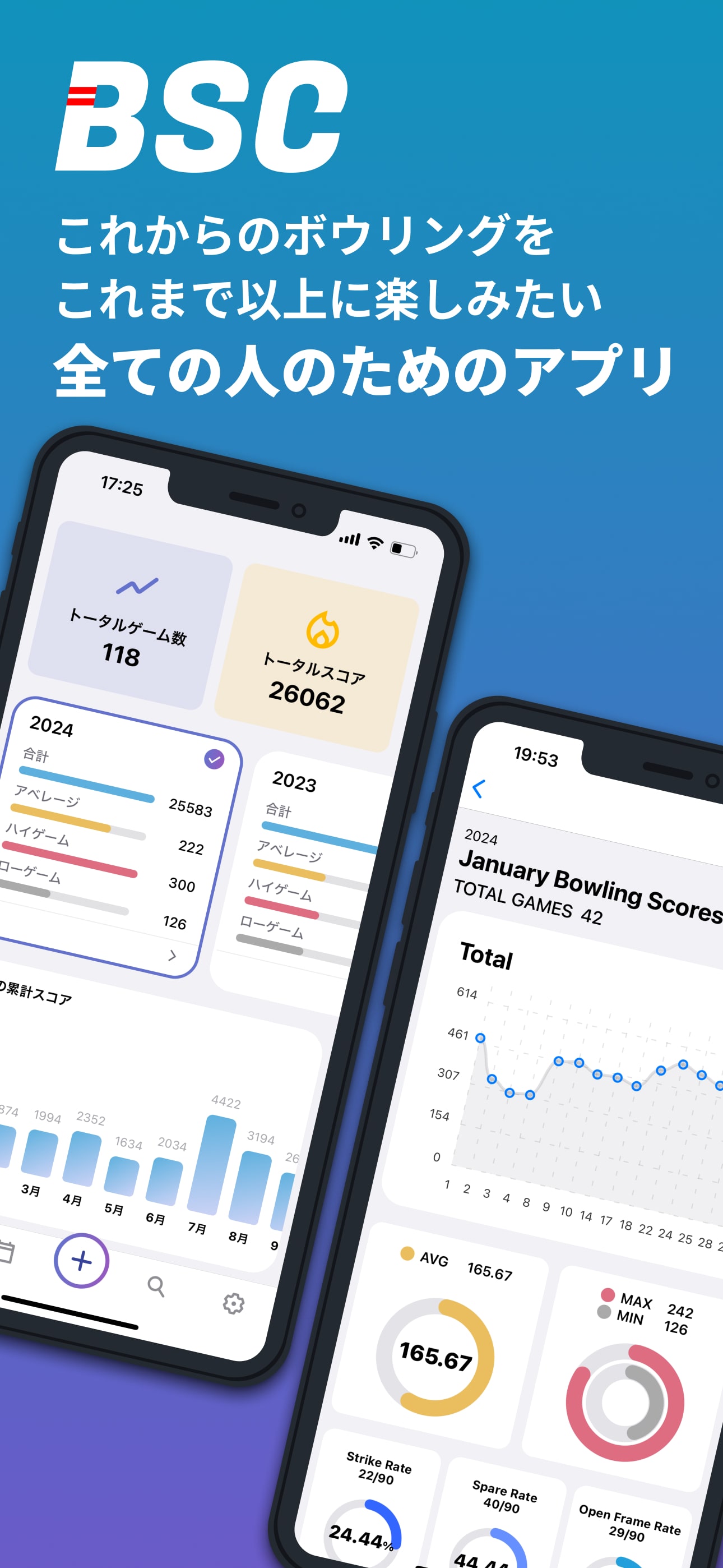 ボウリングのスコアを計算することが可能です。フレームごとに倒れた本数を入力していくことで最終スコアが計算されます。複数のゲームを登録すると平均やストライク確率などデータ分析結果も確認可能です。