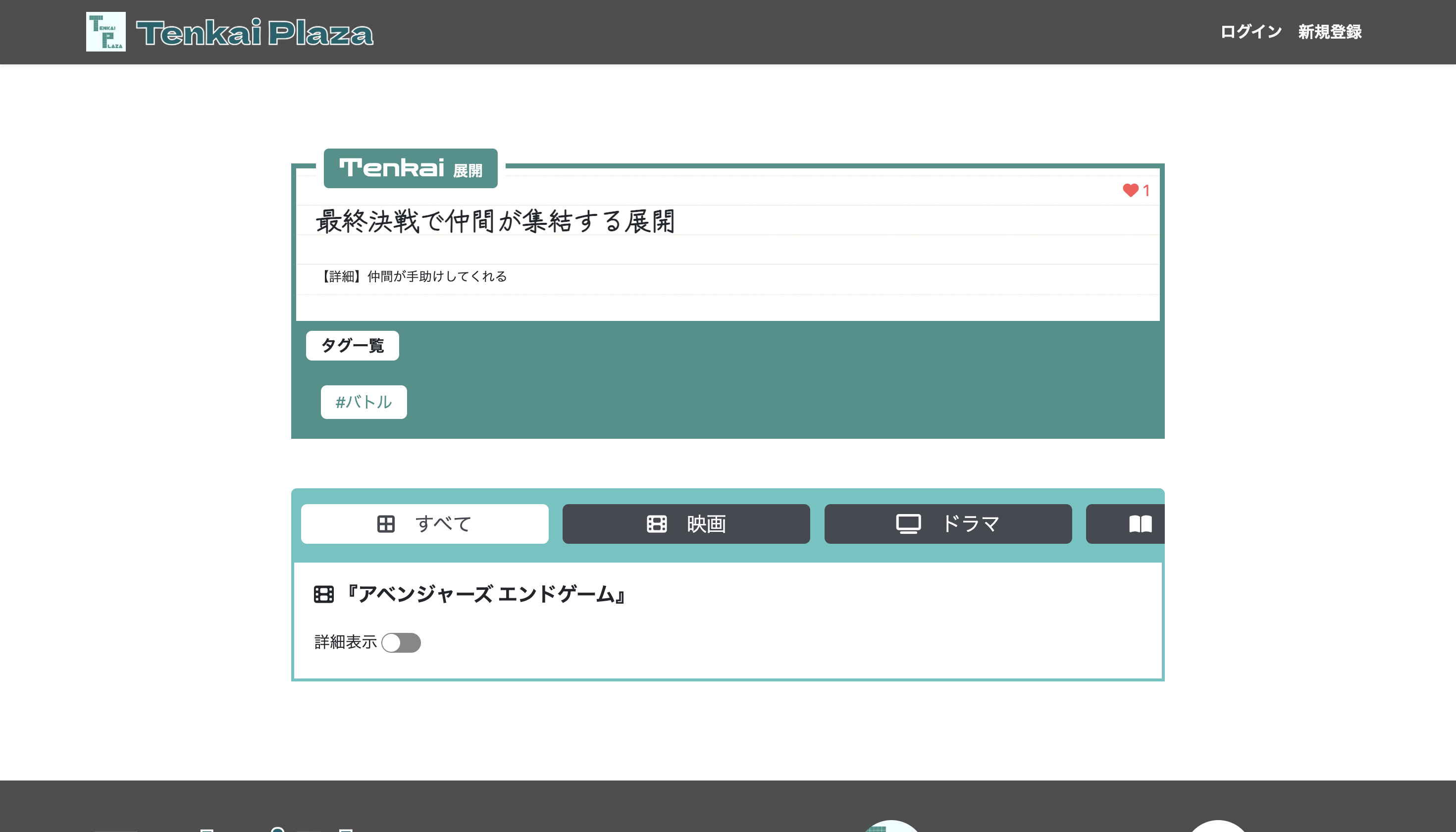 映画・ドラマ・アニメ・漫画・小説・ゲームなどのストーリーにおいて好きな展開や演出、キャラクター設定を共有できるサービス。
