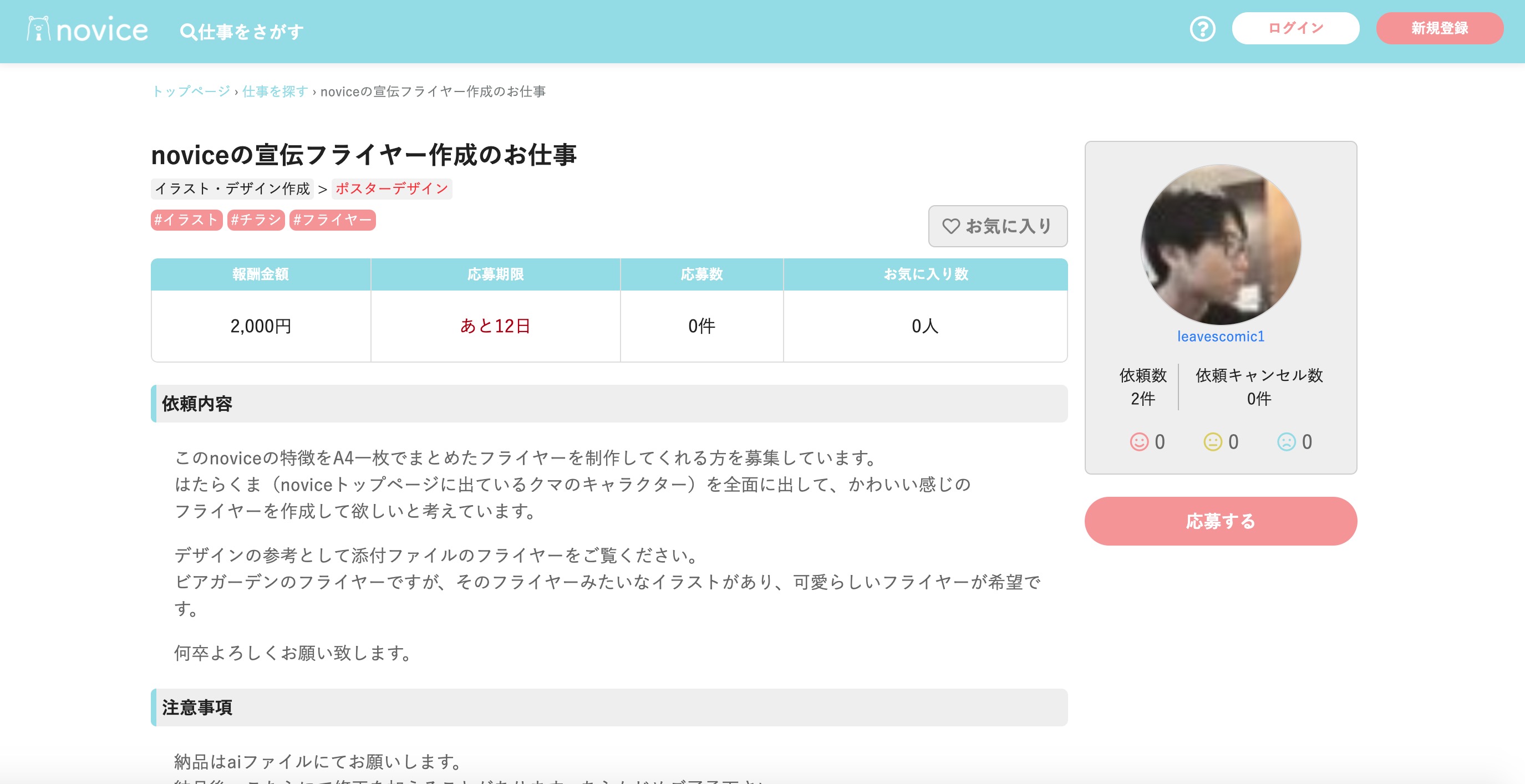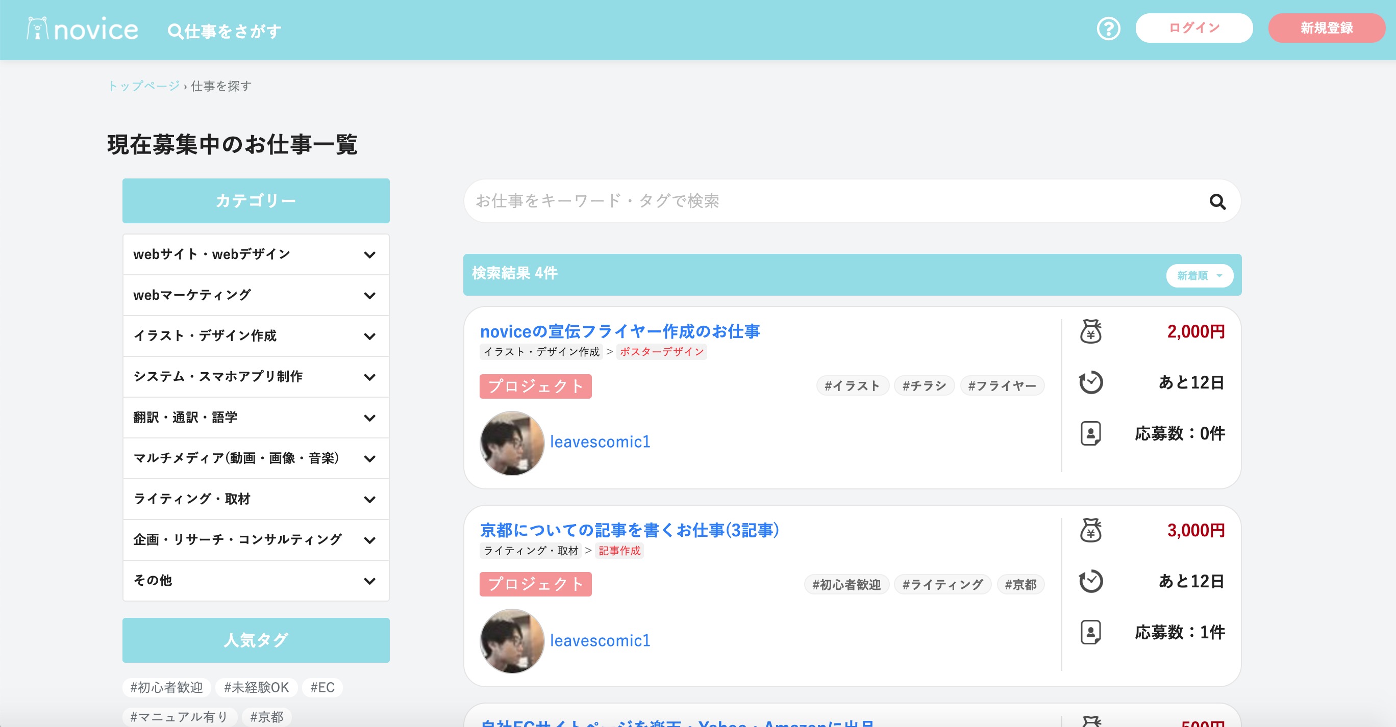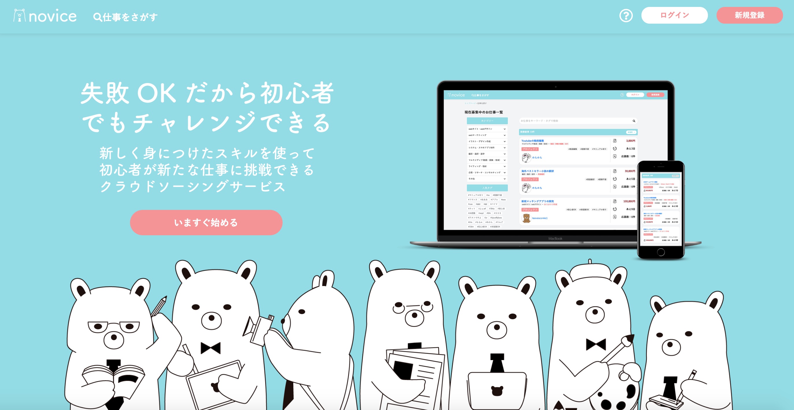 「novice」は様々な分野での初心者・未経験者向けのクラウドソーシングサービスであり、安く仕事を依頼したいユーザーと、実績や経験をとにかく積みたいユーザーをマッチングするwebサービスです。