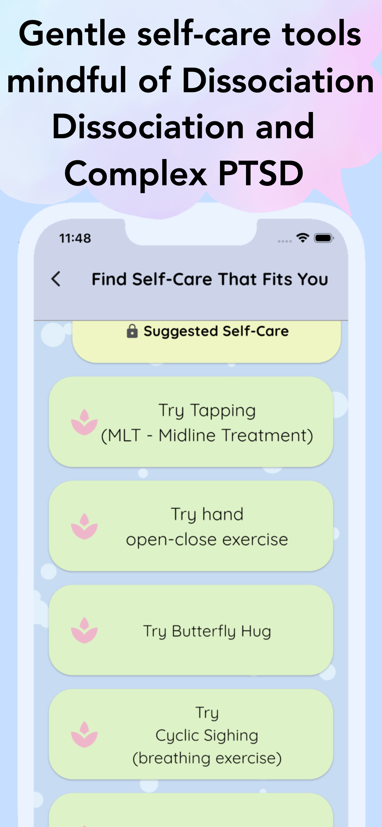 ・Thoughtfully designed for people living with PTSD, complex PTSD, and dissociative symptoms.