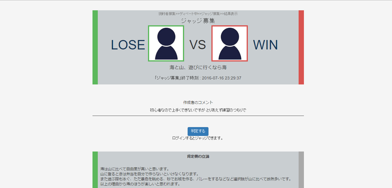 会員登録するとコメントがリアルタイムで反映出来たり、他の人のディベートをジャッジ(審判)として採点出来るようになります。